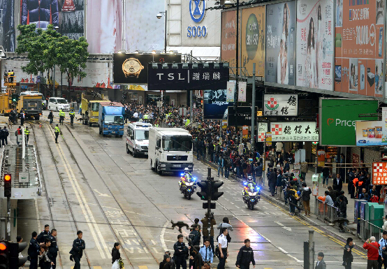 警方在接近中午12時,再次在“占領區”流動高臺上發出廣播,呼吁在場人士沿怡和街向百德新街方向離開,只要出示身份證明文件,可安全離開,否則警方會采取進一步行動,將他們移離或拘捕。