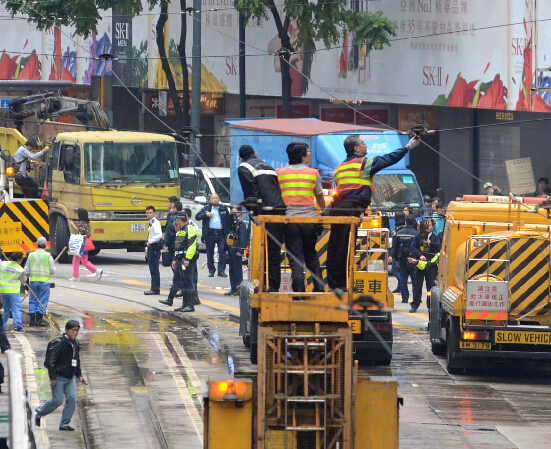 警方在下午約13時05分完成銅鑼灣“占領區”清障行動,怡和街東西行線恢復通車,電車已恢復行駛。