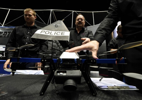 12月13日,在美國洛杉磯,一家展商的工作人員展示一架為警用領域開發的無人機。