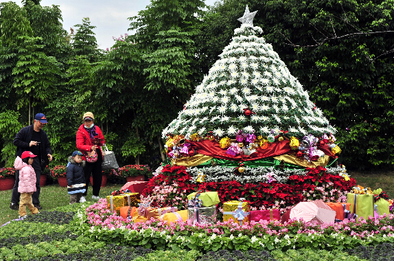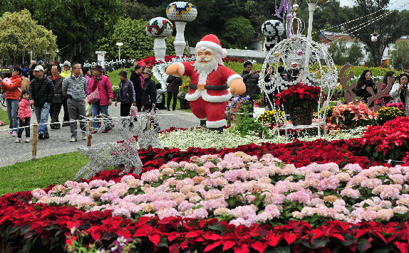 人們在臺北花博公園欣賞圣誕主題花卉造型。