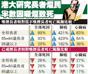 【香港商報網】記者周偉立報道:香港大學李嘉誠醫學院聯同衛生署,於全港18個長者健康中心進行一項長達近11年的追踪研究發現,在65歲或以上吸烟長者中,每2個至少有1個因吸烟而死亡;85歲或以上的一群中,每4個亦至少有1個死於吸烟。吸烟長者死於肺癌與心臟病的風險比不吸烟長者分別高出逾4倍(421%)及近1倍(63%)。相反,戒烟長者,與吸烟長者相比,因全部死因(即死於不同原因)、肺癌和心臟病而死亡的風險明顯較低。研究結果清楚表明,戒烟能有效降低死亡風險,有關研究結果早前已於國際醫學雜誌Addiction上發表。
