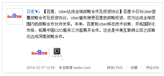 新浪科技訊 12月17日中午消息,百度今日宣布與矽穀創業公司打車應用Uber在北京簽署戰略合作及投資協議。Uber接受百度的戰略投資,雙方達成全球范圍內的戰略合作夥伴關系。未來雙方將在技術創新、開拓國際化市場、拓展中國O2O服務三個方面展開合作。