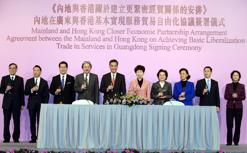 梁振英指出,廣東是香港十分重要的經貿夥伴,兩地經濟關系密切,互惠互利。香港本地生產總值有超過90%是服務業,服務貿易自由化協議對香港經濟的進一步發展,對香港人包括年輕人的事業發展,意義重大。自2003年內地與香港簽署CEPA(內地與香港關於建立更緊密經貿關系的安排)開始,過去11年,內地和香港不斷深化和擴大有關安排。
