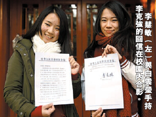李克強與北大學妹的書信情誼緣於去年10月13日李克強訪問泰國時到清邁崇華新生華立學校參觀,與該校學生對話交流。今年9月,該校白雲瑩和李慧敏通過北京大學在泰國海外學生招考面試,進入北大學習。入校一個多月後,白雲瑩和李慧敏即分別給李克強寫信。