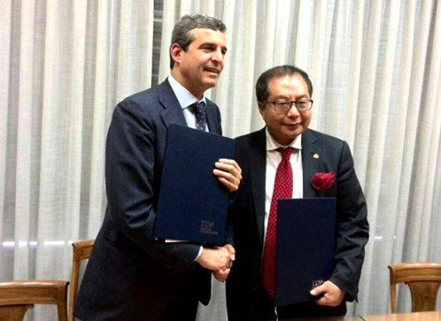 意大利國家對外貿易委員會主席里卡多·蒙蒂、亞太交流與合作基金會執行副主席肖武男分別代表各自機構簽署的合約。在儀式上,里卡多·蒙蒂主席代表意大利政府和米蘭世博會組委會,歡迎亞太交流與合作基金會參與米蘭世博會的建設及促進該會與亞太地區各國建立多邊交流與合作。