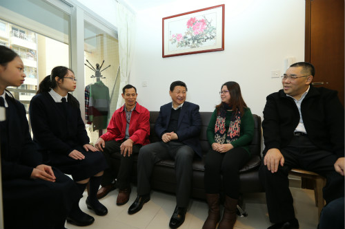 在石排湾公屋项目的沙盘前,习近平听取项目负责人介绍情况,详细询问房屋建筑布局、周边配套设施建设和公屋申请条件等。随後,他来到乐群楼5座,走进位於20层的居民谭玉娥家中。见到习主席来了,谭玉娥一家十分激动,热情向主席问好。习近平微笑回应,同一家人亲切握手。