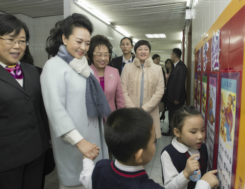 12月19日,习近平主席夫人彭丽媛在崔世安夫人霍慧芬陪同下,来到澳门妇联学校幼稚园参观看望。