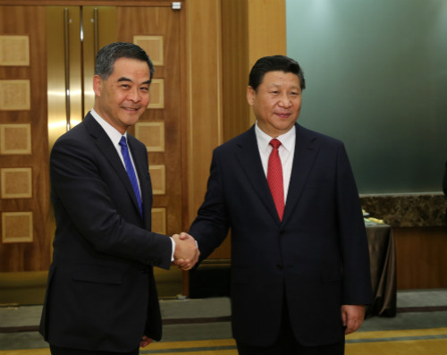 梁振英感谢习近平的肯定鼓励和中央政府对香港的关心支持。他表示,香港特别行政区政府将团结一致,尽心竭力,做好各方面工作,依法推进民主发展,坚定不移维护香港长期繁荣稳定。