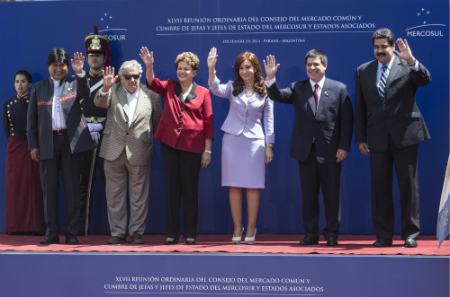 12月17日,在阿根廷北部城市巴拉那,出席首脑会议的(前排从左到右)玻利维亚总统莫拉莱斯、乌拉圭总统穆希卡、巴西总统罗塞夫、阿根廷总统克里斯蒂娜、巴拉圭总统卡特斯和委内瑞拉总统马杜罗挥手致意。