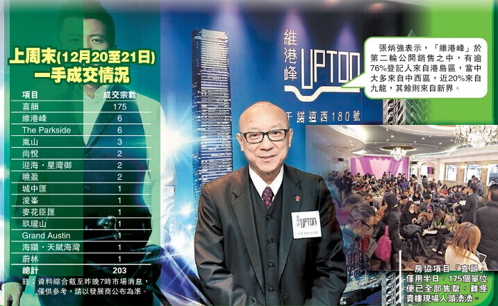 【香港商報訊】記者劉思桐、實習記者王理琪報道:聖誕佳節將至,發展商推盤攻勢不減,令一手市場持續熱鬧。綜合市場消息,過去周末兩日(12月20至21日),應市新盤共錄約203宗成交,較前一周末僅約60宗急升2.3倍。當中,房協旗下長沙灣「喜韻」上周六發售175個單位,即日迅速沽清,可謂撐起大市。英皇國際(163)旗下西營盤「維港峰」昨進行次輪銷售,發展商指,項目開售至今共套現逾11億元,正積極考慮加推。