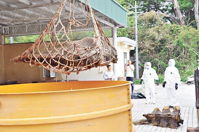 制作標本過程的其中一個工序:利用吊雞車將鯨魚骨放在器皿中再加熱。