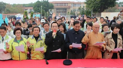 由陳水扁所創立的“一邊一‘國’連線”在九合一選舉大有斬獲,全臺縣市議員當選70人,23日約有50人親自到臺中監獄前,參與由總召陳唐山擔任監誓,執行長陳致中帶領的“向人民宣誓就職”活動,綠營議員輪流發言,讓民眾情緒高亢,高喊“陳水扁無罪”要讓臺北的馬英九聽見。