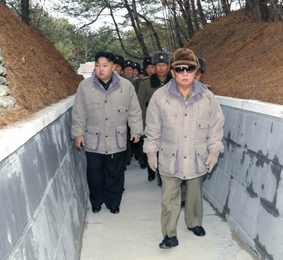 金正日生前和金正恩一同視察,兩人身穿同款棉襖。
