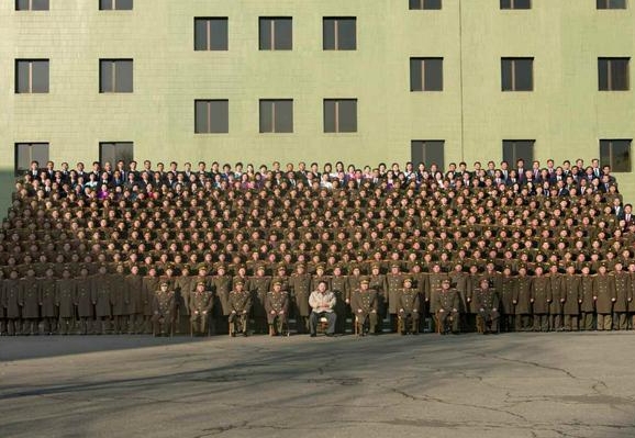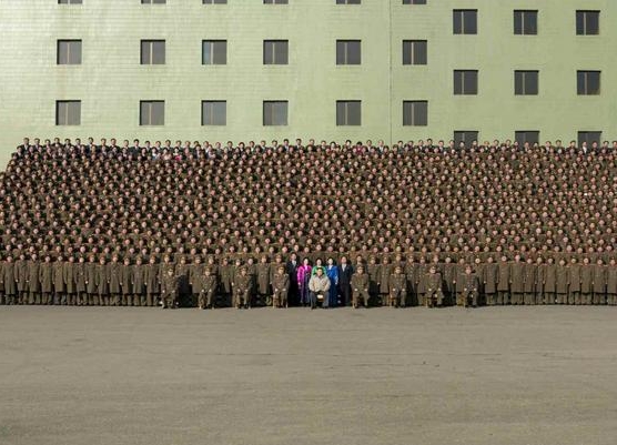 據朝中社12月25日報道,朝鮮最高領導人金正恩同朝鮮人民軍第二次後勤工作者大會與會者合影留念。圖為金正恩和後勤工作者合影外衣與父親同款(圖片來源:勞動新聞)