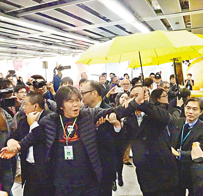 梁國雄於慶典會場搗亂,被工作人員帶離場。