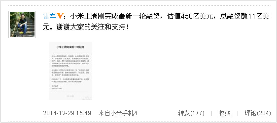 新浪科技訊 12月29日下午消息,雷軍在微博宣佈小米上週末剛完成最新一輪融資,公司估值450億美元,總融資額11億美元,此次融資投資者包括All-stars、DST、GIC、厚樸投資和雲鋒基金等投資機構。