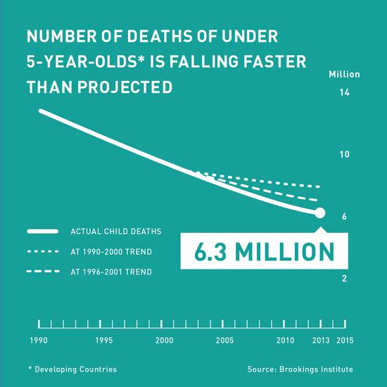 對我來說,衡量人類進步的最好方式之一,就是看看有多少兒童死于可以預防的原因。現在,能活著度過5歲生日的兒童比以往任何時候都多。到今年為止,全球兒童死亡率已經至少連續42年下滑。事態不僅向著正確的方向發展,速度也超出所有人的預期。《經濟學人》今年9月發表的一篇文章估計,自2001年以來,全世界已經挽救了1360萬兒童的生命。很難想像出還有比這更能象徵社會進步的指標。