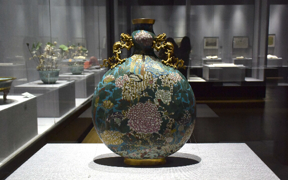 觀眾在觀看圓明園當年收藏的銅胎掐絲琺瑯扁瓶。