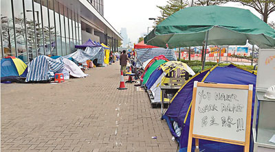 香港立法會大樓對面的添美道行人路兩側被百餘個帳篷佔據。(圖片來源:中評社)