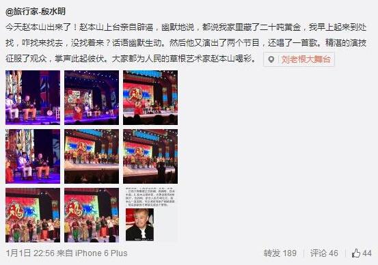 1日晚22時50分左右,網友“旅行家-殷水明”在網上發表消息,稱“趙本山出來了!趙本上上臺親自辟謠,幽默地說,都說我家里藏了二十噸黃金,咋找來找去,沒找著呢?他又演出了兩個節目,還唱了一首歌。”并對趙本山的登臺充滿溢美之詞,稱“精湛的演技征服了觀眾,掌聲此起彼伏。大家都為人民的草根藝術家趙本山喝彩。 ”隨后趙本山的弟子程野轉發了微博,并說“歡迎您常來,驚喜不斷!”