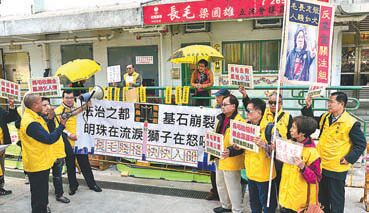 「反黑金關注組」一行約30人昨日穿著黃色背心,帶同「長毛收黑金、亂港黑人憎」、「長毛走狗、戲班小丑」等標語,到長毛位於沙田大圍新翠恏的辦事處示威。代表宣讀聲明指,長毛破壞議會秩序,以「真普選」作藉口,要求學生「占中」自毀前程,不配作為立法會議員,另外長毛更以高薪霸著公屋,并疑似「收黑金」亂港,香港社會實在容不下這位「黑議員」,要求長毛辭職及離開香港。