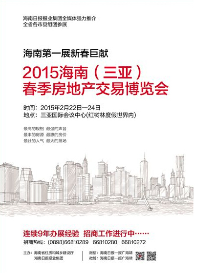近日,海南省委提出有關市縣在旺季要做好房地產促銷工作的要求。為落實省委部署,海南省住建廳和海南日報報業集團決定,2月22日至24日(即正月初四至初六),在剛剛落成的三亞市最大城市綜合體——三亞灣紅樹林國際會議中心,舉行2015年海南(三亞)春季房地產交易博覽會,打響海南新的一年樓市促銷第一炮。