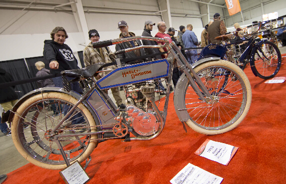 在加拿大多倫多,觀眾在摩托車展上參觀一輛1912年生產的哈雷摩托車。