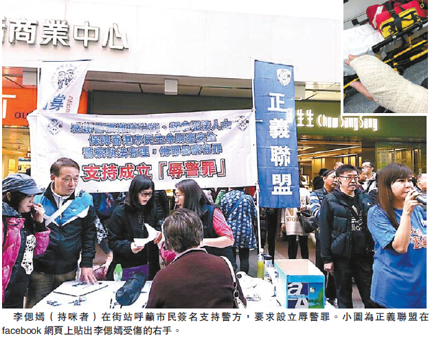 【香港商報网訊】記者林駿強報道:「正義聯盟」、「撐警大聯盟」昨日起舉行為期十四周的簽名行動,支持警方於「占領」行動期間執法,同時要求設立辱警罪,懲處肆意侮辱警員人士,行動獲各行各業市民熱烈響應。而行動召集人李偲嫣昨日於旺角擺街站期間,被數名激進青年襲擊,導致手部受傷,需送往醫院驗傷及治療,涉事激進青年被帶署助查。