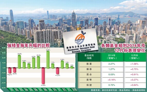 雖然2014年MPF回報有1.78%,略勝於恒指全年1.28%的升幅,但相比A股逾50%的升幅差了一大截。對於MPF表現一般,康宏強積金業務拓展董事鍾建強表示,因為約36%的MPF資產是投放在港股,另約33%投資於債券和現金及存款,總數約69%,而這兩類的投資回報表現有目共睹,因此MPF去年表現難免差強人意。