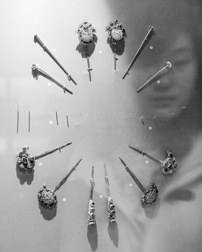 湖北省博展廳內仍在展出的部分梁莊王墓文物,部分金鳳簪的位置已空出 胡冬冬 攝影