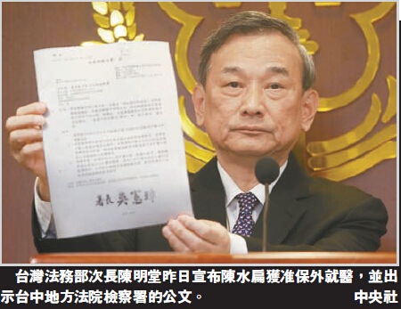 法務部5日在臺北舉行記者會,政務次長陳明堂介紹說,經該部門矯正署當日上午召開10人審查小組會議,認為陳水扁病情比去年5月時顯著惡化,病情復雜,難以控制,隨時有致死危險,核準讓陳水扁保外就醫1個月。至於擴大鑒定小組建議陳水扁保外醫治期間由監獄設定醫療小組照護,陳明堂表示,於法無據無法采納,保外就醫期間的醫療須由陳水扁家屬全權負責及照料,并提供相關治療病況供監獄派員查看。