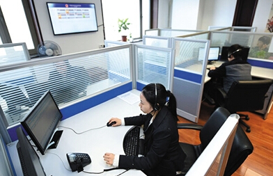 辦公區內也是敞開式辦公,大工作間內設置若干隔斷,每個工作人員的辦公桌面上都有兩臺電腦、一部電話,再無其他物品。