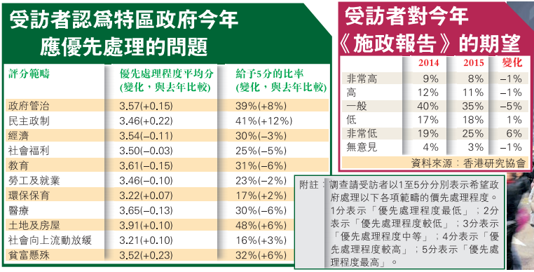 《施政報告》將發表,香港研究協會昨公布「市民對2015年特首梁振英《施政報告》的期望調查」,調查顯示市民對貧富懸殊、政制的關注度有提升;該會於本月2至8日展開抽樣電話訪問,成功訪問1077名18歲或以上市民。