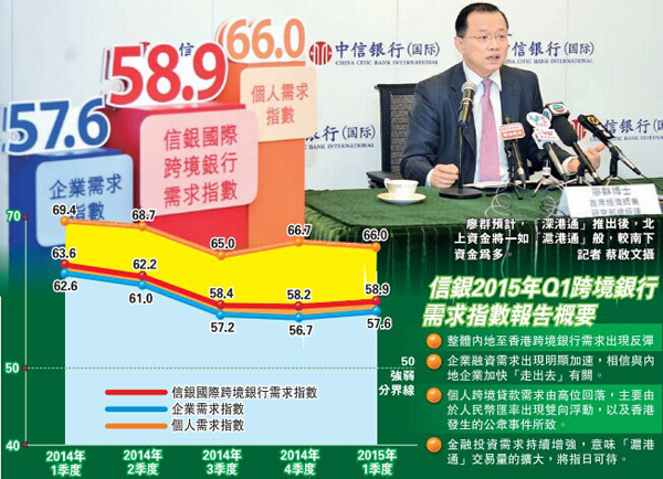 另一方面,信行昨日公布「2015年第一季度信銀國際跨境銀行需求指數」,整體指數由2014年第四季度的58.2,上升0.7點,至2015年首季度的58.9;其中「金融投資」分部方面,受惠「滬港通」效應,該部分指數由去年第四季度的70.1,上升1.4點,至2015年首季度的71.5,反映內地個人投資者赴港進行金融投資的熱情未有減退。