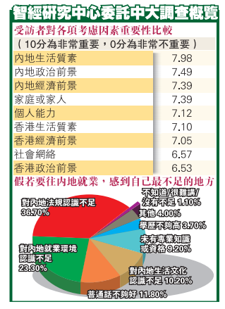 中大香港亞太研究所副研究員李鏗指出,香港青年如有意往內地工作發展,主要認為自己最不足是對內地法規和就業環境的認識。他說,受訪者在考慮前往內地就業時,主要考慮內地各方面的「拉因素」,如內地的生活質素、政治和經濟前景,反之香港本地的「推因素」則屬較為次要的考慮。
