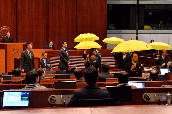 行政長官梁振英早上十一時到立法會公布任內第三份施政報告。不過,多名泛民議員在會議廳內舉起黃色傘及橫額,並高叫「梁振英落臺」等口號,然後集體離開議事廳,而人民力量議員陳偉業及陳志全則繼續在場內抗議,兩人最後被抬離場。立法會主席曾鈺成一度宣布會議暫停。