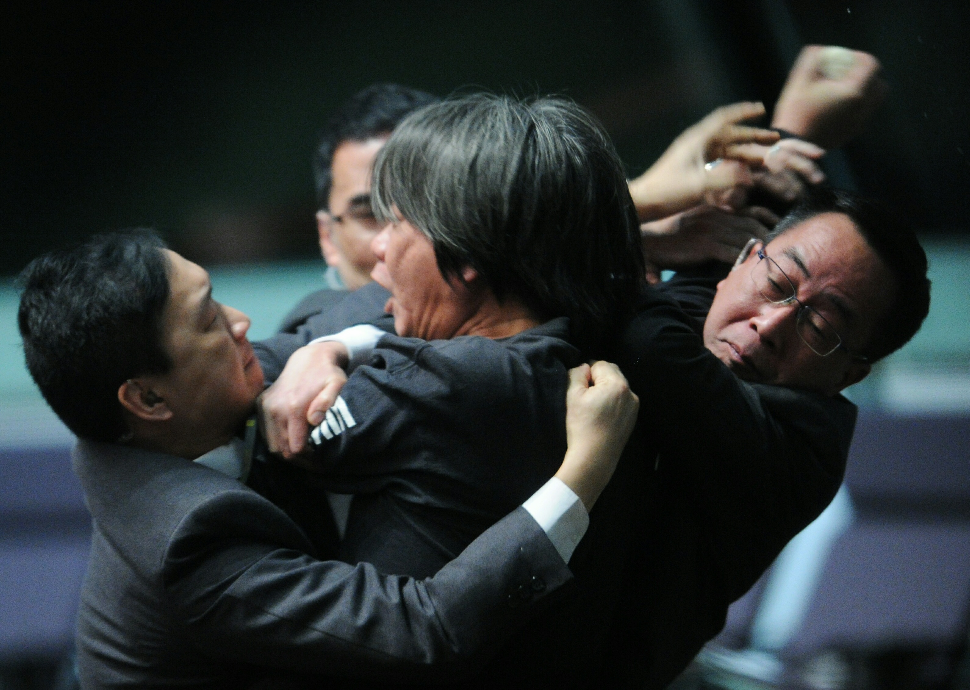 當天,其他激進反對派依舊以激烈行動搶鏡,社民連議員梁國雄、人民力量議員陳偉業及陳志全當日不時在座位大喊,打斷他人發言,被多次警告。最後,三人因投擲豆沙包、支票等物件而被曾鈺成驅逐離場;獨立議員黃毓民則在會議首5分鐘就因大吵大鬧而被趕離場。