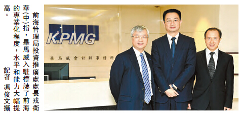 畢馬威中國是首家獲批在前海成立外商獨資企業的國際會計師事務所,作為全球四大行之一的畢馬威,進駐前海起了非常好的帶動引領和示範作用,其後於今年1月6日,德勤也在前海註冊。戎衛華說:「畢馬威入駐標誌了前海的專業化程度,水準和能力大幅提高,希望繼續提高註冊數量和質量,打造香港服務業產業集群,2020年達到1萬家香港企業目標。」