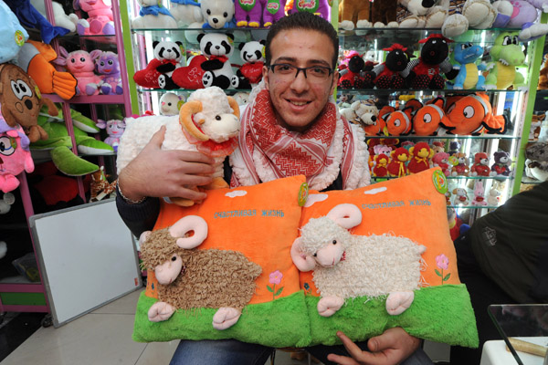 約旦客商哈姆紮·艾哈邁德在義烏中國小商品城捧著他訂貨的羊年吉祥物合影(2014年12月14日攝)。新華社記者 譚進 攝