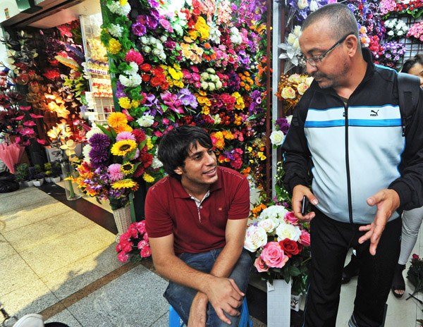 阿爾及利亞客商哈薩姆(右)、莫拉德在義烏中國小商品城討論模擬花卉採購計畫(2014年9月22日攝)。新華社記者 譚進 攝