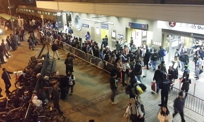 港鐵特遣隊人員聯同警方,前日在港鐵上水站嚴格執行每位旅客只可帶不超過二十三公斤行李的規定,打擊水貨客攜大件行李衝閘,職員如發現旅客行李超重,會要求過磅驗證,人龍一度長達數百米。