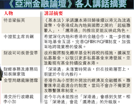 出席同一場合的肖鋼則指,香港是內地金融市場和國際接軌的重要窗口,「滬港通」的開啟進一步拓展了兩地市場的深度和廣度。近年來內地財富管理需求旺盛,迫切要求繼續深化內地和香港的金融合作,進一步推動兩地金融互認,完善QFII和RQFII制度,進一步加強兩地跨境業務的發展。