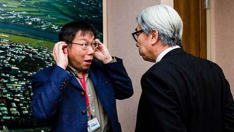 鴻海董事長郭臺銘今買下各報頭版廣告,限臺北市長柯文哲(左)48小時內公開資料否則停工,圖為柯在記者采訪前與人交談時露出吃驚的表情。(郭吉銓攝)