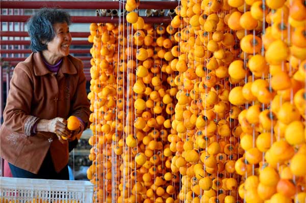 在山東省臨朐縣匯鑫農產品專業合作社,工作人員將削皮後的柿子掛起晾曬(2014年10月26日攝)。新華社記者郭緒雷 攝