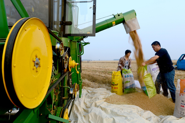 在山東省夏津縣鄭保屯鎮,農民在收割機旁接小麥(2014年6月12日攝)。 新華社記者郭緒雷 攝