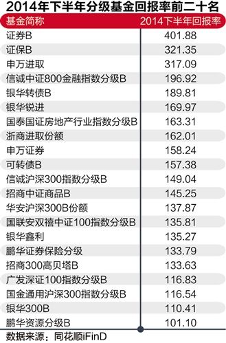 同花順iFinD統計顯示,截至2014年12月31日,包括證券B、證保B、申萬進取等在內的21只分級基金六個月內的總回報率超過了100%,其中申萬菱信基金管理的證券B(150172.SZ)和申萬進取(150023.SZ)半年回報率達401.88%和317.09%;而鵬華基金旗下的證保B(150178.SZ)的同期回報率也高達321.35%。