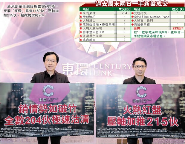 一手新盤方面,近期熱賣的東涌「東環」於上周六進行第三輪銷售,涉及204個單位,即日再獲沽清,帶動過去周末一手新盤交投錄約233宗成交,按周跌約41%。新地副董事總經理雷霆昨日指出,「東環」第四輪的銷情可用「再創高峰」來形容,現時項目累積售出約1150個單位,暫時套現約60億元,現再加推215個單位,輕微加價約2%。