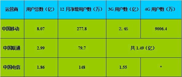 日前,三大運營商陸續公布了2014年12月的運營數據。數據來看,中國移動(微博)去年12月總用戶數達8.07億、淨增用戶數量達到277.8萬,位列三大運營商之首。