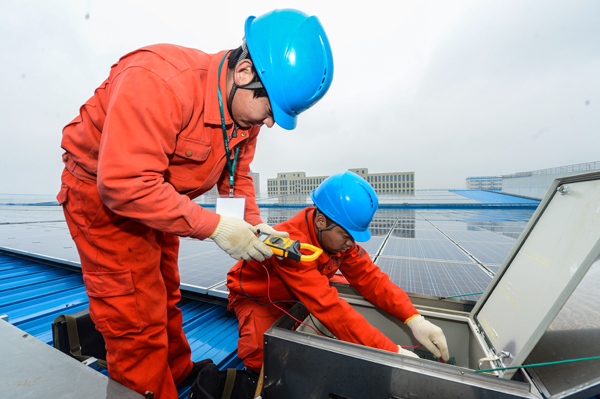 1月29日,浙江德清縣供電公司工作人員檢查已經並網的天馬重工機械有限公司廠區光伏屋頂。