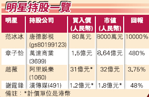 明星炒股不稀奇,稀奇的是找準節拍選對方向。粗略統計明星持股有四大流派,以趙薇為代表的遍地開花型,優點是永不落空。以謝霆鋒為代表的一箭雙雕型,借殼上市有著落。以范冰冰為代表的近水樓臺型,充分發揮主人翁精神。以章子怡為代表的意願巧合型,需要很好的運氣和眼光。